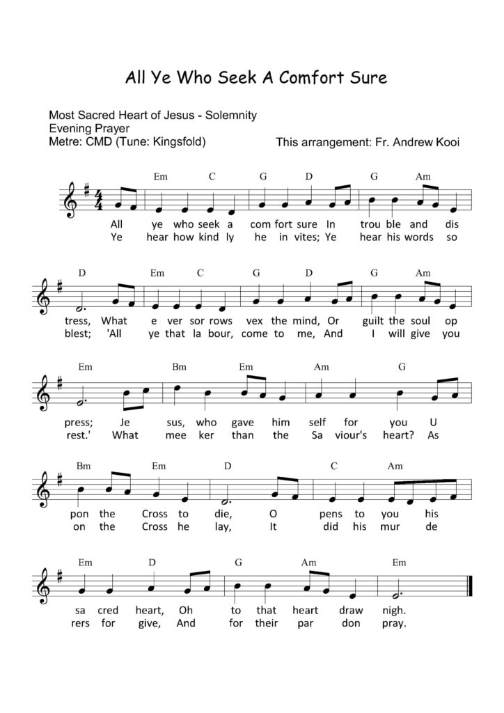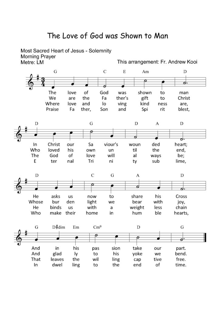 Solemnities of the Lord Most Holy Trinity Evening Prayer - Hymn #37 - Firmly I Believe and Truly Morning Prayer - Father most holy, gracious and forgiving Hymn has 2 versions. Version 1 uses the tune from the hymn "Father, We Praise You."Version 2 uses the tune from the hymn "Sing, All Creation." Corpus Christi Evening Prayer - Hail our Saviour's glorious Body Hymn uses the tune from the hymn "Gall He Drinks, His Strength Subduing." Morning Prayer - Forth from on high the Father sends Hymn has 3 versions. Version 1 uses the tune from the hymn "Now That The Daylight Fills The Sky."Version 2 uses the tune from the hymn "Come, O Creator Spirit, Come."Version 3 uses the tune from the hymn "All People That On Earth Do Well." Most Sacred Heart of Jesus Evening Prayer - All Ye Who Seek a Comfort Sure Evening Prayer - All Ye Who Seek a Comfort Sure Tune: KingsfoldMetre: CMD Morning Prayer - The love of God was shown to man Hymn has 3 versions. Version 1 uses the tune from the hymn "Now That The Daylight Fills The Sky."Version 2 uses the tune from the hymn "Come, O Creator Spirit, Come."Version 3 uses the tune from the hymn "All People That On Earth Do Well." Morning Prayer - The love of God was shown to man Tune: AbendsMetre: LM Alternative Hymn #38 - To Christ, the Prince of Peace Alternative Hymn #39 - O Sacred Heart, Our Home lies Deep in Thee Christ the King Evening Prayer - Hail Redeemer, King divine! Morning Prayer - To Christ the Lord of worlds we sing Hymn has 3 versions. Version 1 uses the tune from the hymn "Now That The Daylight Fills The Sky."Version 2 uses the tune from the hymn "Come, O Creator Spirit, Come."Version 3 uses the tune from the hymn "All People That On Earth Do Well."